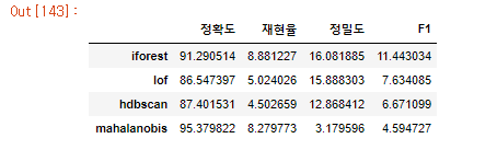 => 따라서 isolatino 과 마할라노비스의 거리를 한 집단, hdbscan과 lof를 하나의 집단으로 구분한 뒤, 두 그룹을 잘 섞으면 좋은 결과를 기대해볼 수 있을 것이다.