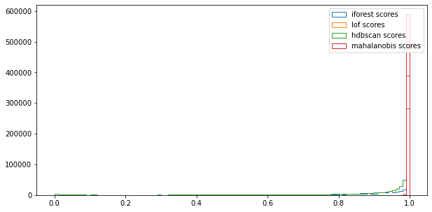 알고리즘을 통해서 계산한 이상치 점수 값의 범위도 다르고 (iforest의 경우 -0에서 -1사이인 반면, 마할라노비스의 경우는 값의 제한도 없고) 의미도 다르다(iforest의 경우 낮을수록 이상치인 것인반면, 마할라노비스의 경우 높을수록 이상치이다). 따라서 모두 일괄적으로 스케일링을 거쳤으며, 적절히 값을 변환하여 모두 0에서 -1 사이의 값을 가지고, 점수가 낮을수록 이상치일 가능성이 높음을 의미하도록 하였다.