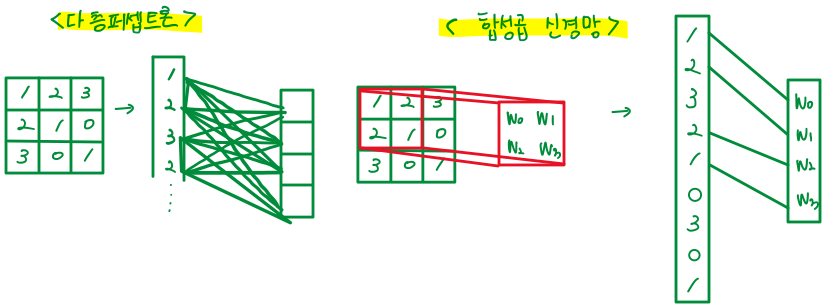 다층퍼셉트론과 합성곱 신경망을 비교하면 다음과 같다.