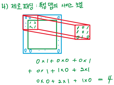 그래서 여러번 convolution layer를 거치면서 어느 정도 특성맵의 크기를 조절해주는 것이, 제로 패딩이다.