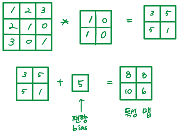 편향은 커널과 합성곱 연산을 한 특성 맵에 더해준다. 하나의 scalar 값만 가지며, 모든 셀에 더해준다.