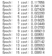 print(f"Epoch: {epoch+1:3} cost: {avg_cost:.6f}")