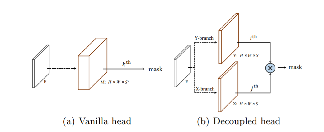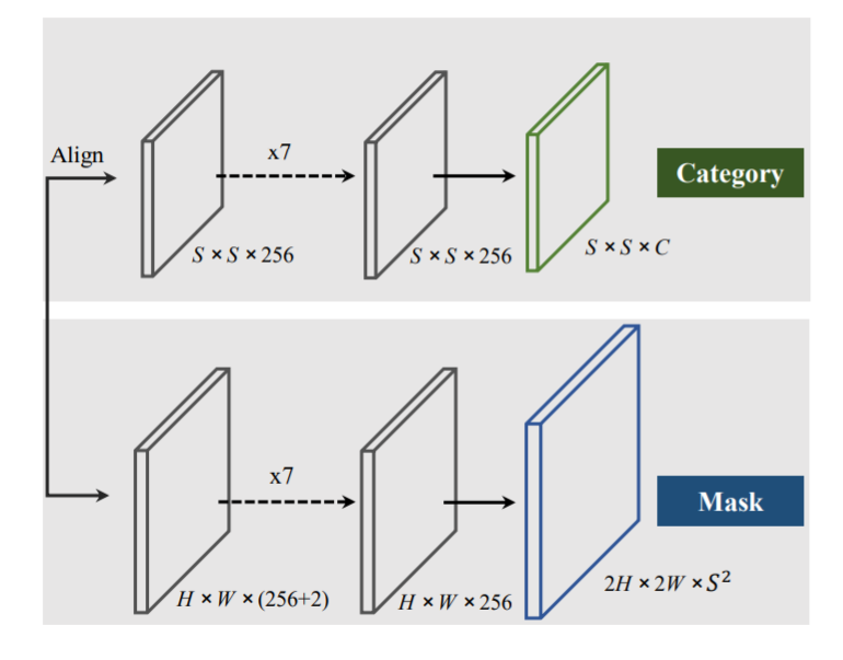 이때의 output tensor의 크기를 보면 HxWx$S^{s}$ 이다. 그러니까 원본 이미지의 해상도에 그리드 갯수만큼 채널이 붙은 셈이다. 따라서 각 그리드 셀 마다 instance mask를 만들게 된다.