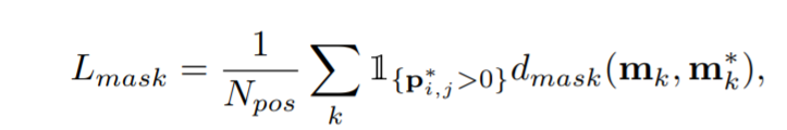 이때 $d_{mask}$는 dice loss 라고 한다. 처음 들어봤다. 다른 Binay Cross Entropy나 Focal Loss 도 같이 사용해봤는데, 지금 사용한 Dice Loss가 많은 하이퍼 파리미터 튜닝 없이 좋은 성능을 낼 수 있어써 채택했다고 한다.