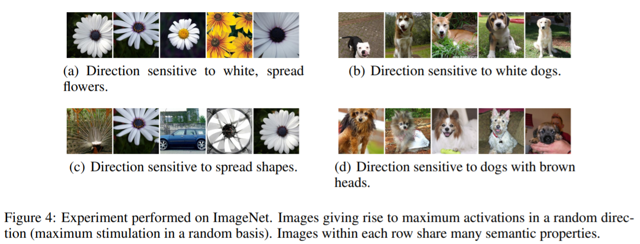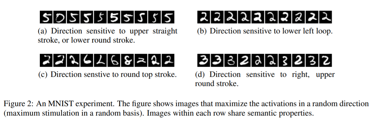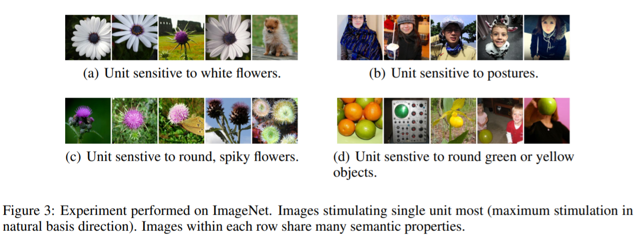 첫번째 속성은 high level의 유닛 하나하나와 그런 high level의 유닛을 랜덤하게 선형결합을 한 것 사이에는 차이가 없었다는 실험 결과에서 기인한다. 즉 이를 통해서 알 수 있는 것은 개별적인 유닛이 아니라 그 공간에서 semnatic information이 있다는 것이다.