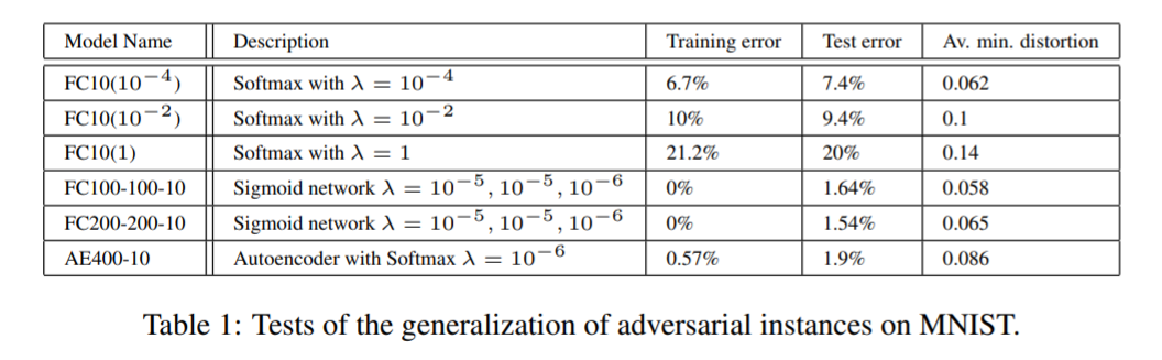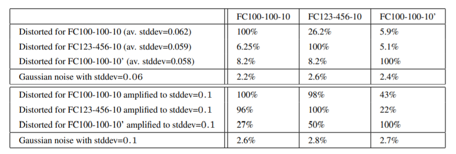 예를 들어서 보면 FC10($10^{-4}$)의 모델에서는 다 missclassify 된 적대적 예제가 FC10($10^{-2}$)의 구조로 학습된 모델에서는 약 11.7%를 잘못 classify 했다는 말이다.