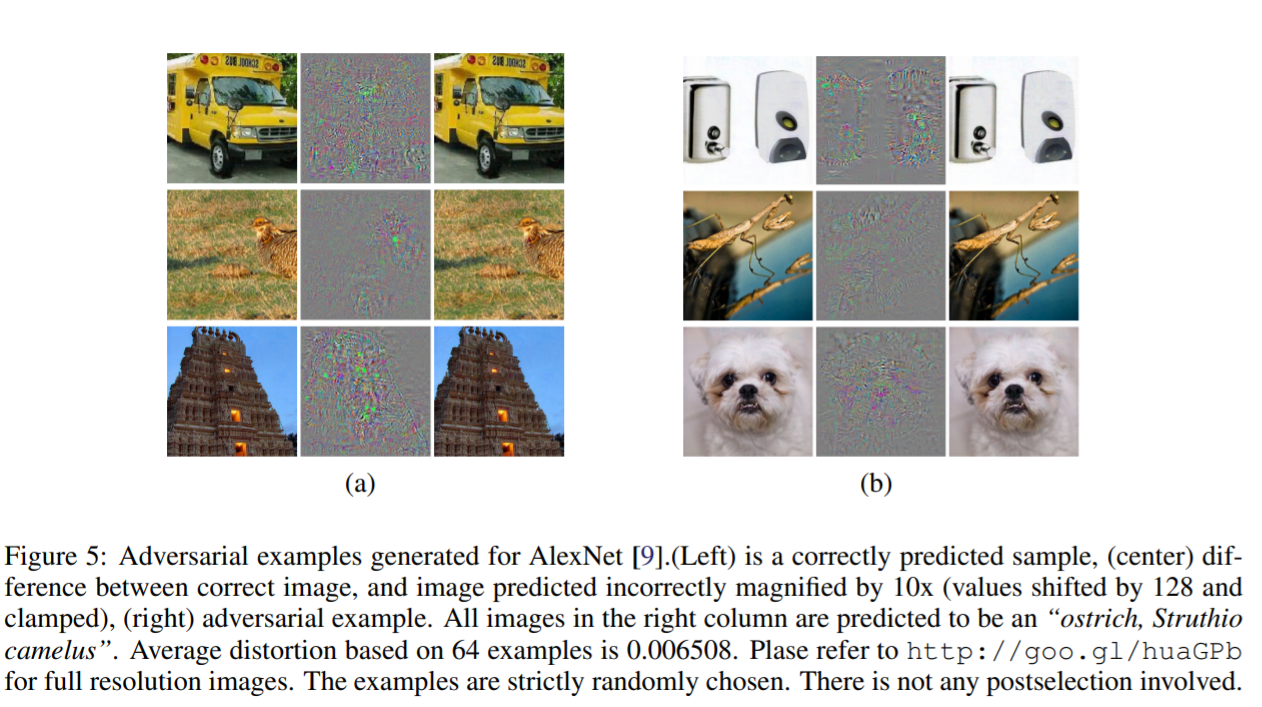 가장 왼쪽 col 은 ImageNet의 데이터 이다. 이거를 모델에 학습시킬 때 (첫번째 row를 예로 들 때) 원래 정답인 차 대신에 타조 로 정답 값을 내도록 input에 변형을 해준다. (이때 이런 변형을 우리가 눈으로 보기에는 눈치 못챌 정도이다.) 가장 오른쪽 col은 이렇게 변형된, 즉 adversarial examples이다. 육안으로 보기에는 아무런 차이가 없어보이지만, 컴퓨터는 정답이 아닌, 다른 레이블로 학습된 상태이다.