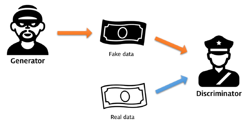 한편 Discriminator는 갈수록 기술이 발전하는 범죄자의 가짜 화폐를 잘 찾아내기 위한 그런 능력을 쌓게 될 것이다.