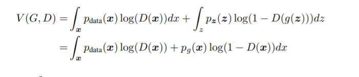 뒤의 텀 $log(1-D(G(z))$ 에서 $G(z)$ 값이 x값이 될 것이기 때문이다. $G(z)$값이 x가 된다면 D(x)는 1을 뱉을 것이고, 결과적으로 저 텀이 무한대가 된다.