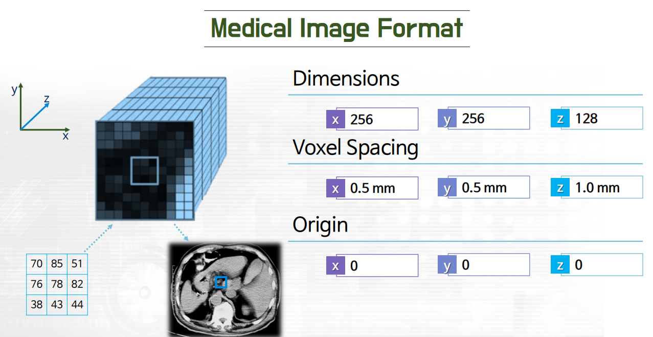 헤더 정보에는 Dimension(이미지 크기), Voxel spacing(2차원에서 픽셀이라면, 3차원에서는 Voxel 즉 픽셀의 두께에 대한 정보) 등이 포함됨