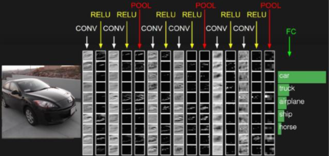 한편 위 이미지는 conv layer의 필터를 거친 후의 feature map들이다. 보시다시피 conv layer를 거쳐감에 따라서 점점 feature map은 interpretable하지 않은 형태를 가진다.