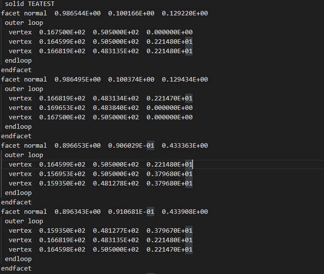 이 3D 에 대한 정보를 담고 있는 STL 파일은 ascii 로 인코딩 된 경우만 이렇게 메모 패드로 열어볼 수 있다. 만약 binary 로 인코딩 된 경우 절대 메모 패드를 통해 열어볼 수 없다. 설령 python의 open 을 이용해서 바이러니 파일을 열었다고 쳐도, 첫번째 문장인 solid teaset 말고는 읽을 수 있는 것이 하나도 없을 것이다. 그러니까 꼭 이 포스팅을 참고하기 전에 STL 파일이 ascii 파일인지, binary 파일인지 확인해보길 바란다... 만약 binary 파일인데 이 포스팅을 따라한다? 스스로 삽질을 파는 것이다.
