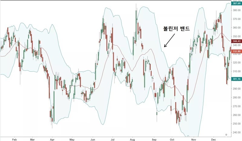 주가의 변동이 표준 정규분포를 따른다는 가정에서 주가의 위아래에 밴드를 표시함으로써 주가의 상대적인 높낮이를 알려준다.