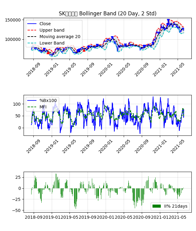 매도 : 상단 밴드 부근에서 일련의 주가 태그가 일어나며, 약세 지표가 확증할 때 매도 (%b > 0.95 && II% < 0)
