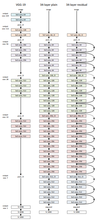 중간의 plain은 레이어를 34개로 늘린 거고, 오른쪽이 residual 을 이용한 모델이다.