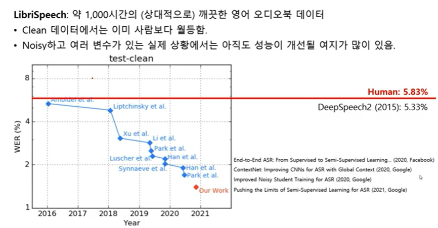 CV의 Imagenet 과 같은 위치의 음성 데이터 셋에서 활약하는 딥러닝 모델의 performance