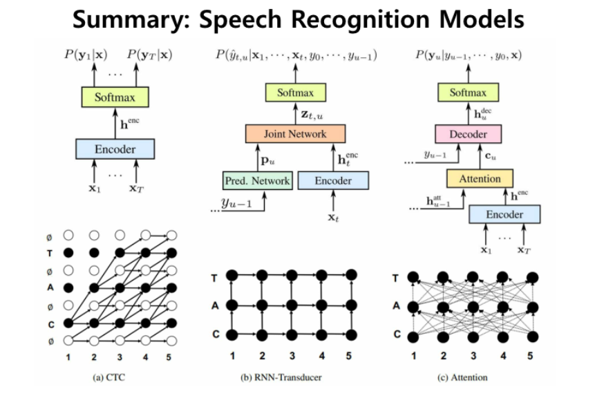 CTC는 인코더만 LAS는 인코더, 디코더 RNN-T는 인코더, joint network, transducer network 가 필요